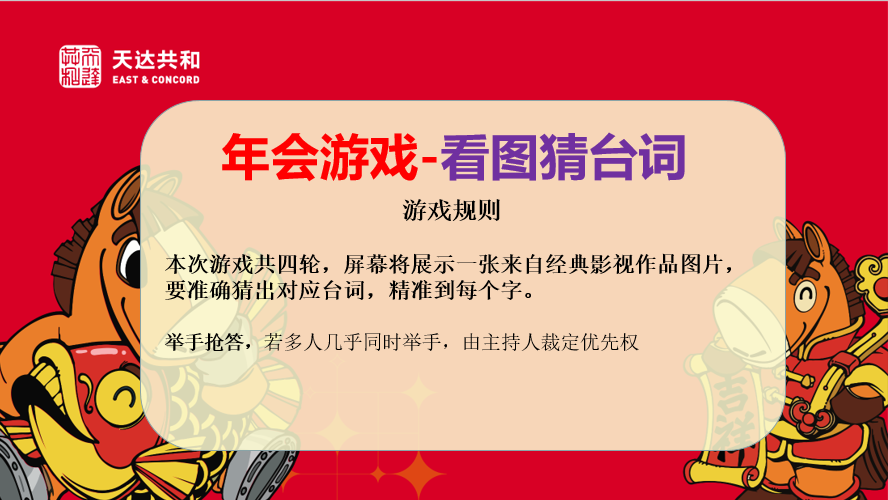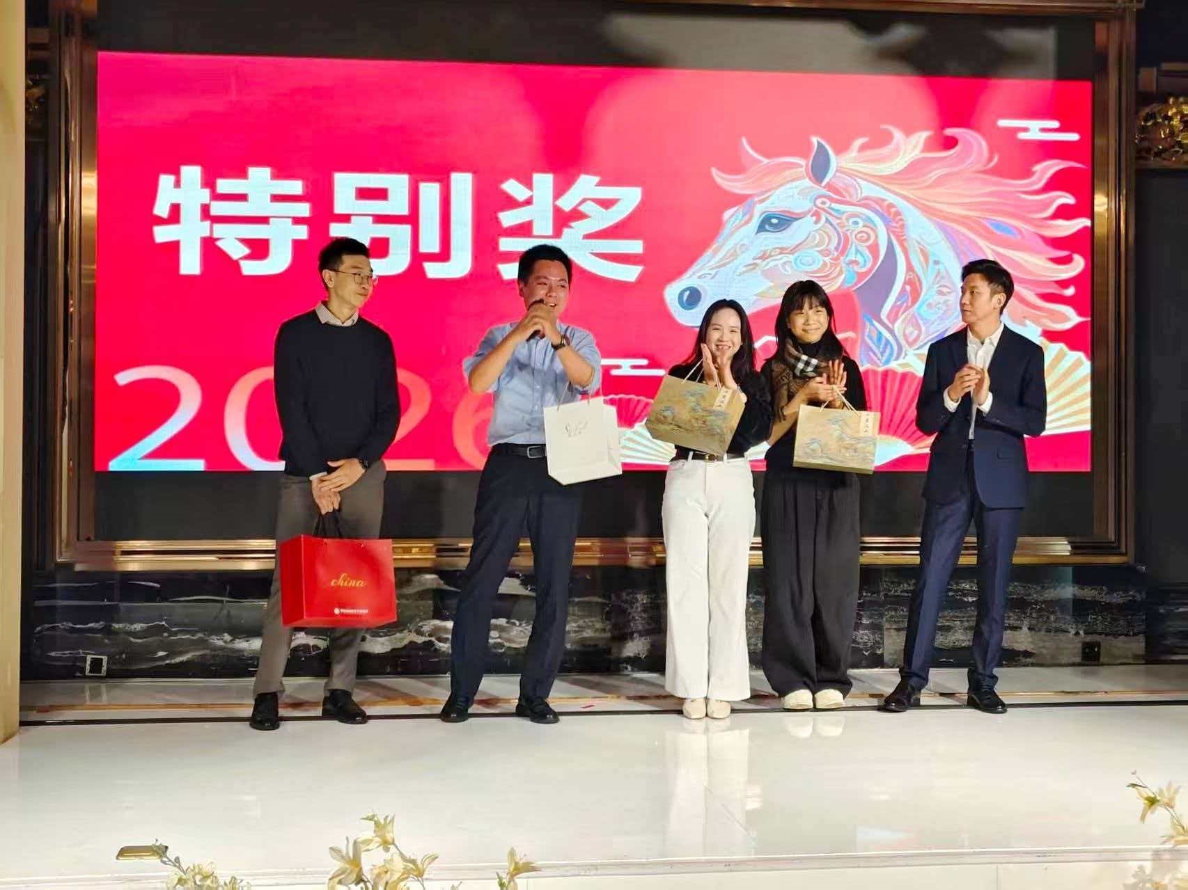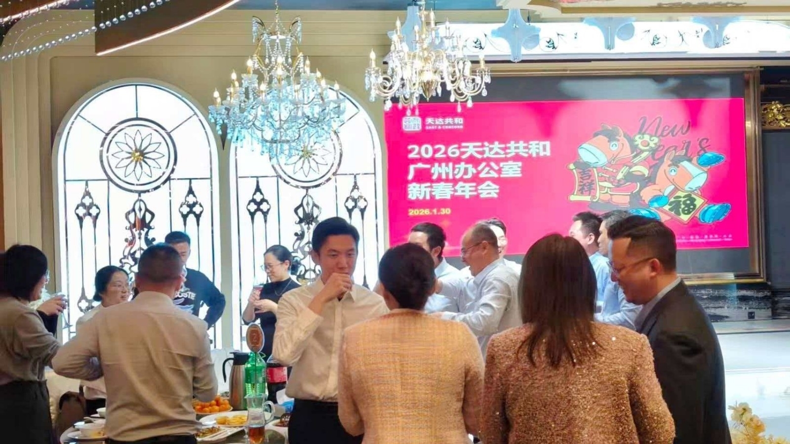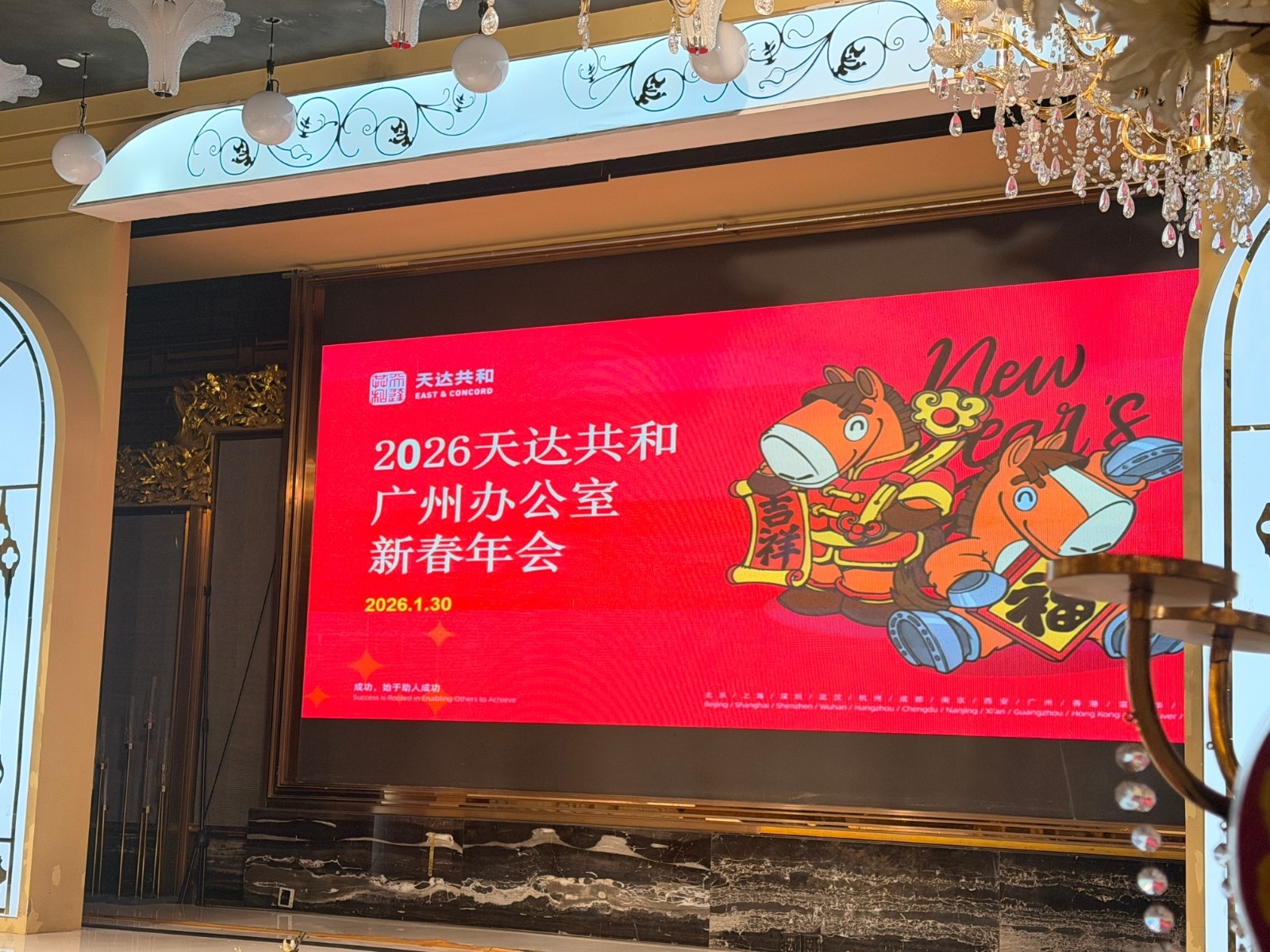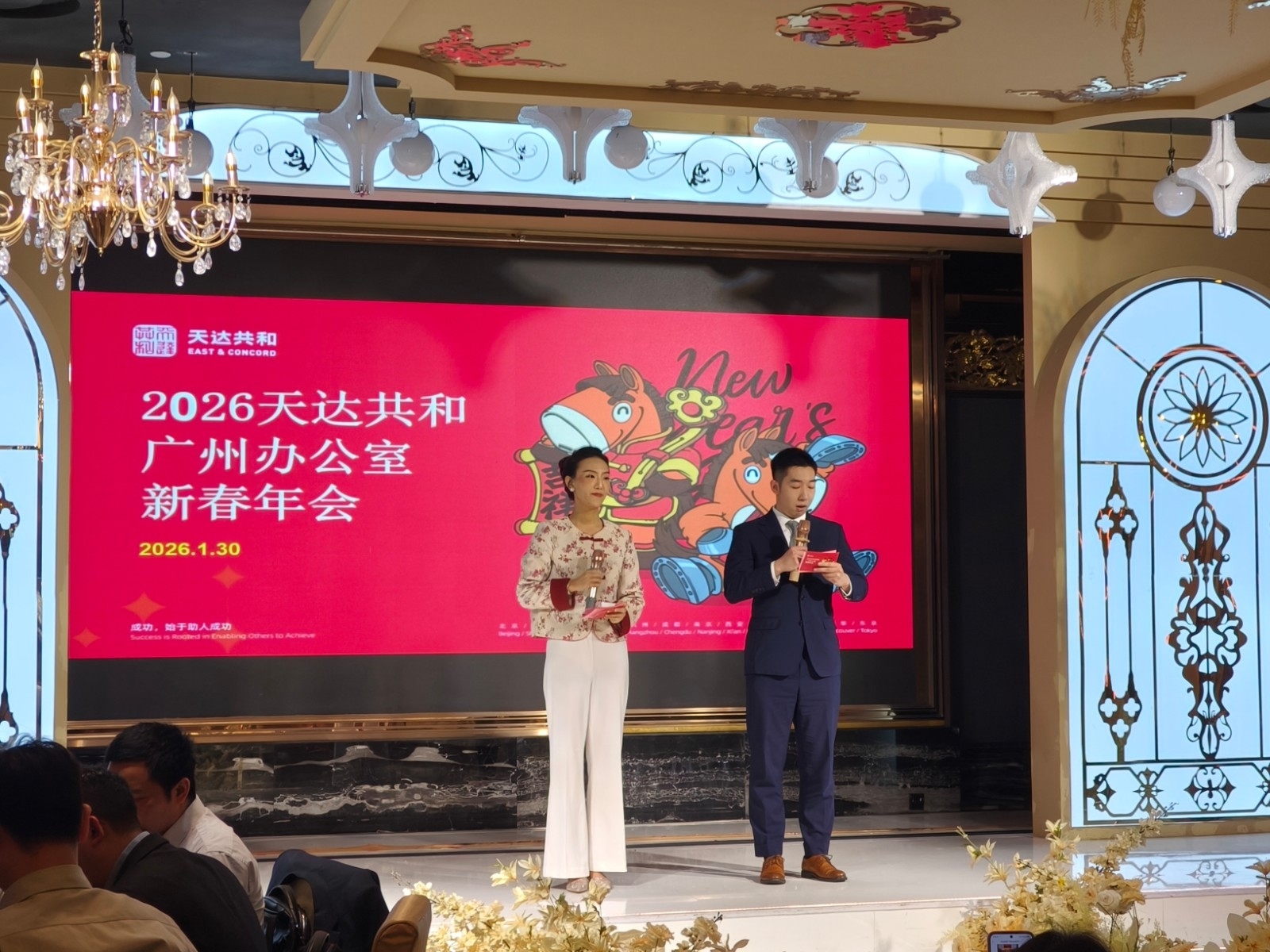 吉日纳鸿福,骏马踏春来,在辞旧迎新的美好时刻,天达共和广州办公室于2026年1月30日成功举办2026年度盛会。全体员工齐聚一堂,通过工作汇报、益智游戏、合唱歌曲与晚宴等形式,共同回顾过往一年的奋斗足迹,展望新岁的发展蓝图,充分彰显了天达共和人同心同行、砥砺奋进的团队风采。