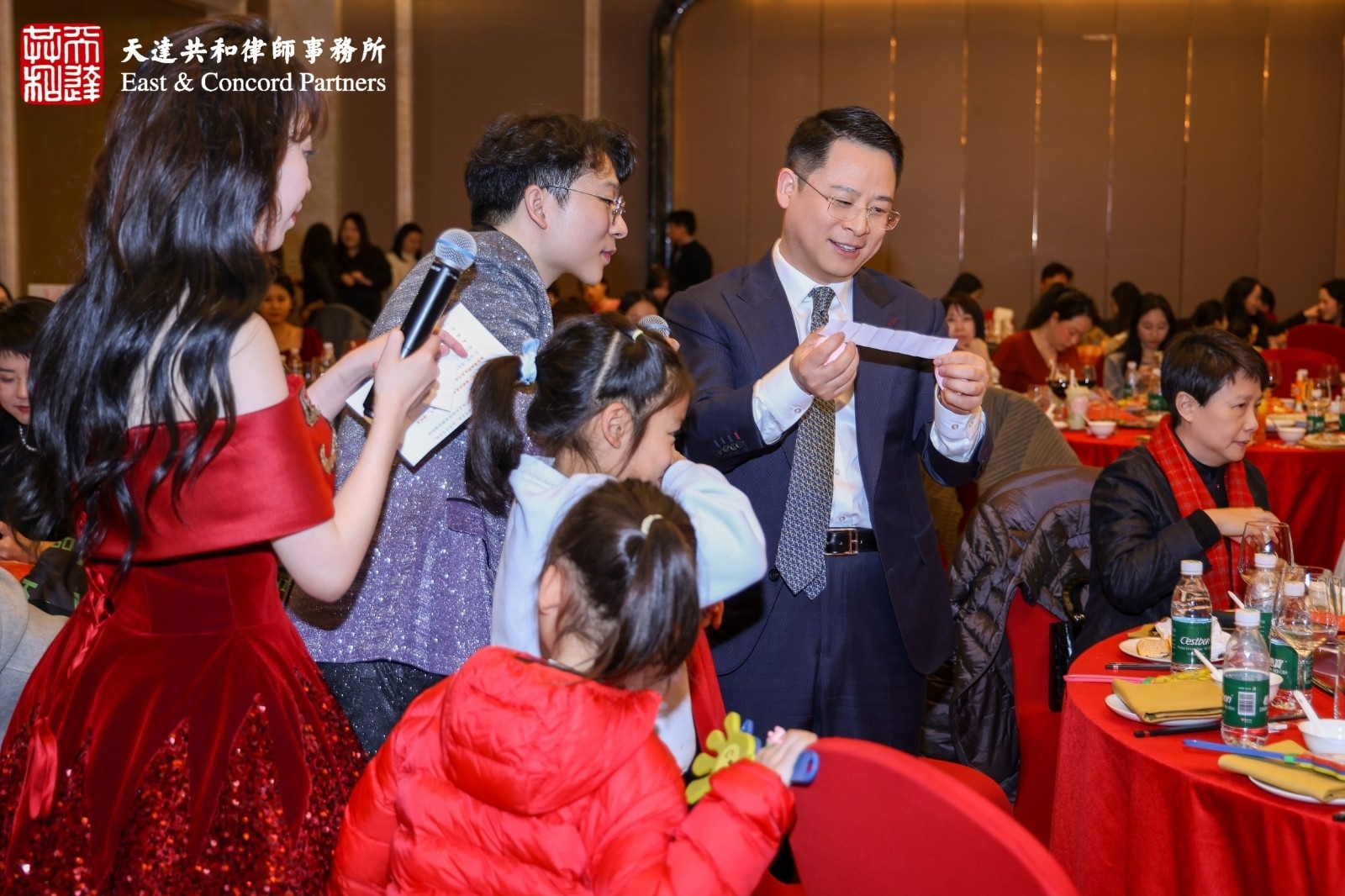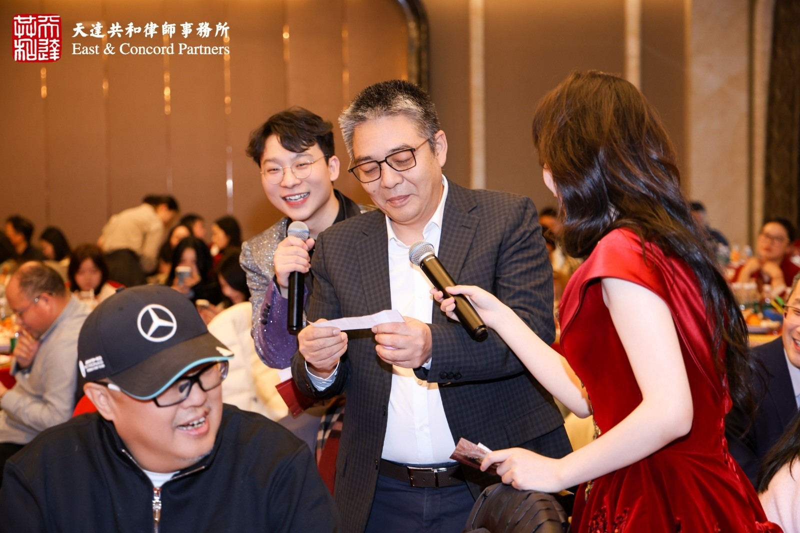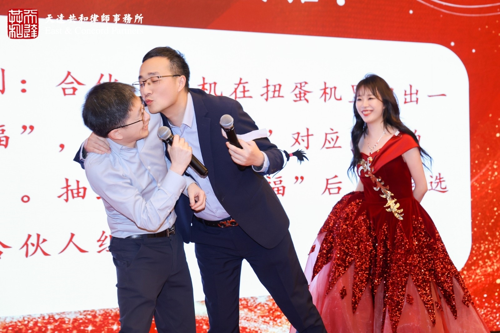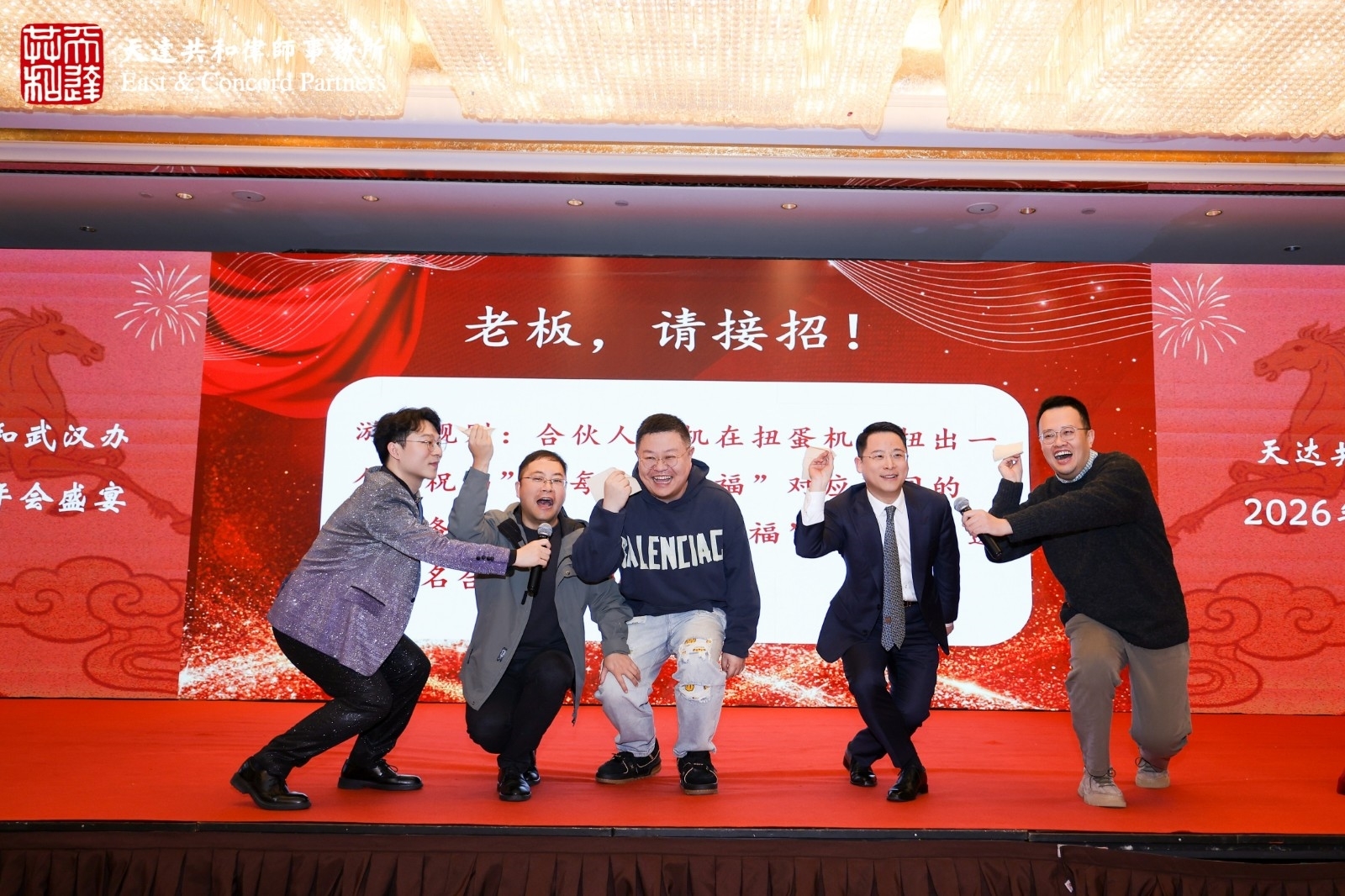 本届年会特设的亮点环节——“老板,请接招!”赢得了阵阵欢笑与掌声。合伙人们启动扭蛋机抽取趣味任务,并邀请其他合伙人共同完成。任务幽默风趣,在轻松互动中充分展现了合伙人们工作之外的另一面,成为全场记忆深刻的欢乐焦点。